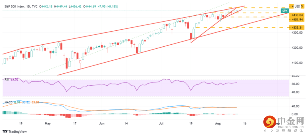尽管如此,标普500指数也没有大幅下跌。动态指标趋于平滑。我们可能最终观察到横向盘整的走势。不过就目前而言,我仍耐心地等待我指出的下跌至4430点或更低的趋势线的出现。