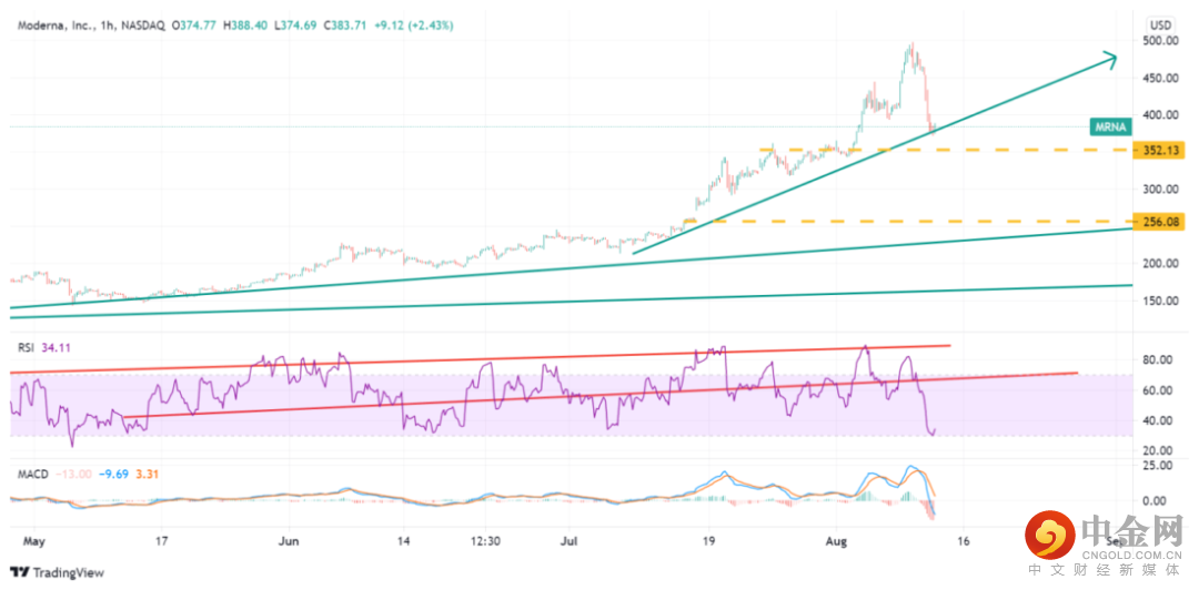 莫德纳公司的股价如市场普遍预期的那样下跌。Gamma逼空如大多数情况一样破裂。目前莫德纳公司的股票在370美元附近找到了一些支撑。至于370美元作为支撑线能发挥作用多久就无人知晓了,不过350美元看起来是更理想的支撑线。
