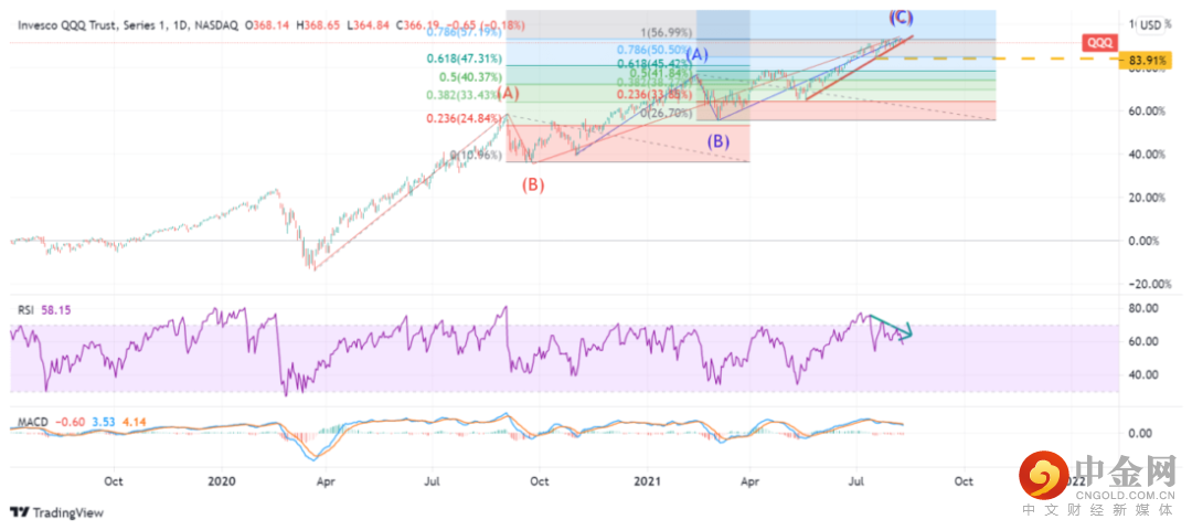 同样的,纳斯达克100指数基金中有2个关键的艾略特波浪和斐波那契水平线在起作用,这意味着当前是顶部和转头下跌的理想点位。纳斯达克100指数自5月低点开始的上行趋势线已经被打破,并且两个C浪似乎均已完成。