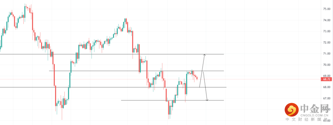 美元指数受承压,原油受支撑,关注67.98的4小时支撑位置,回调收多可看多至70.94,止损67.55;关注69.45压力位,4小时受阻收空即可看空至66.81,止损69.84