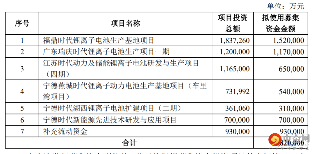 融这么多钱干什么呢?据宁德时代披露,在扣除发行费用后拟全部用于:福鼎时代锂离子电池生产基地项目;广东瑞庆时代锂离子电池生产项目一期、江苏时代动力及储能锂离子电池研发与生产项目(四期)、宁德蕉城时代锂离子动力电池生产基地项目(车里湾项目)、宁德时代湖西锂离子电池扩建项目(二期)、宁德时代新能源先进技术研发与应用项目、补充流动资金。