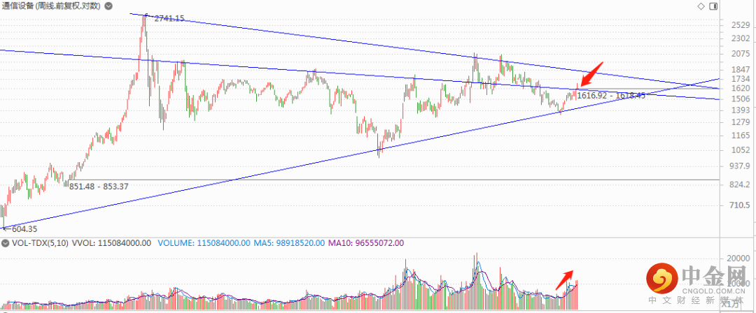 通信设备行业指数(880490)周线目前逐渐开始放量上行,目前行业指数周线已经突破第一个技术压力位(上图中红色箭头指示),未来指数若能站稳这个技术压力位,则指数将继续上攻上面的压力位。总体来说,通信设备行业累计涨幅相对偏小(前期调整时间很长),整体行业估值处于相对较低的位置,若未来通信设备行业指数周线能成功突破并站稳上面的技术压力位,则指数将开始一波周线级别的上涨行情。