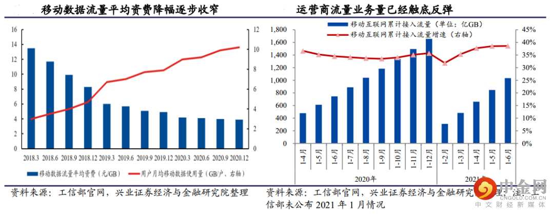 5G驱动流量爆发,流量资费降幅逐渐收窄。2021年1-6月,移动互联网累计流量达1033亿GB,同比增长38.6%,实现连续四个月提速增长。与此同时,提速降费缓和、取消市场份额考核等,驱动运营商行业进入良性竞争,流量资费的降幅逐渐收窄。2021年4月,我国流量平均单位约为3.23元/GB,同比下降25%,环比2021年一季度下降2.1%,移动数据流量平均资费降幅进一步收窄。