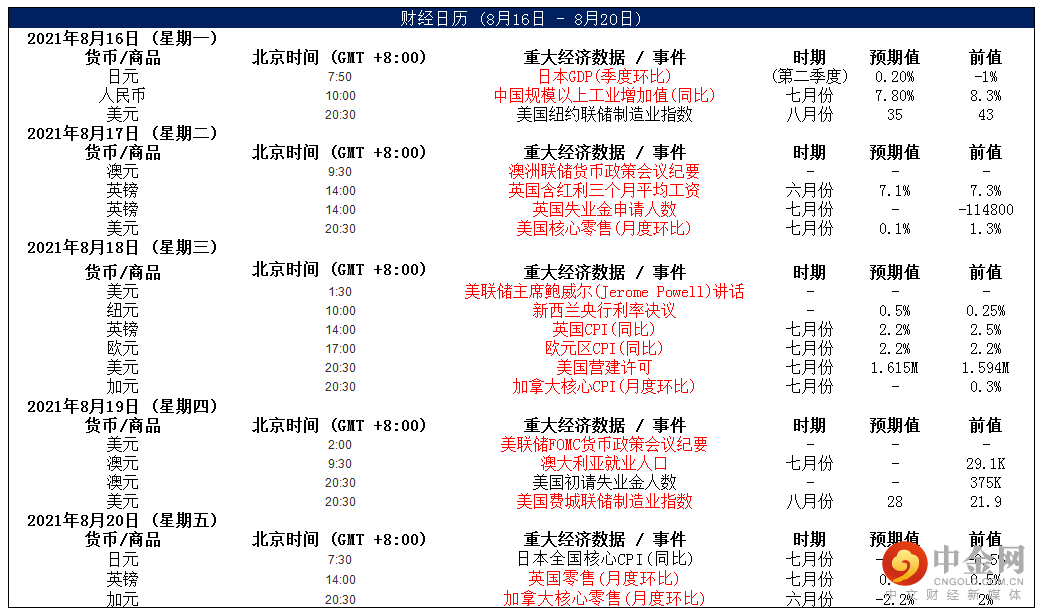 周一,美元兑日元跌0.31%至109.24;主要是因阿富汗政治紧张局势以及新冠Delta变种病毒的扩散打压了风险偏好。因此,短线预计美元兑日元仍然承压。