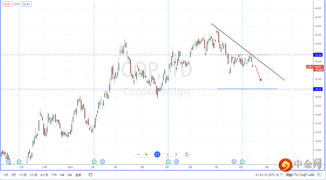 COP:在短期市场放缓之后,由于美国消费信心指数的大幅下行,造成乐观情绪不佳,以及整体产业继续下行。从ETF标的中,能源类产业则继续向下拐头。从COP目前整体趋势在横盘区间调整后继续在多重压制区域受阻,上方水平压制带在57.50附近。短期可关注价格调整后继续走弱的空头机会,下方区间目标位置参考48.75一带。