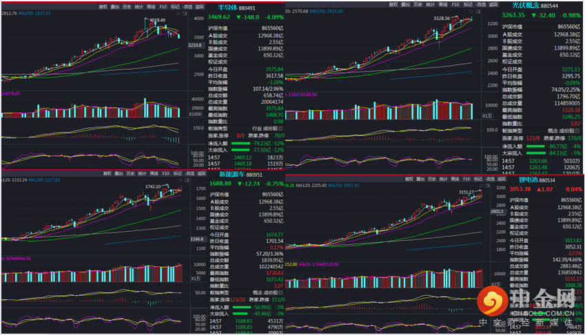 最后,半导体、光伏等成长板块调整过后还有机会吗?我们认为,半导体、光伏、新能源汽车等板块是政策大力支持发展的行业,也是国家实现经济转型、提高国家竞争力的战略方向,中长期行业景气周期持续向上。其短线的回调,更多是因为它们前期累计涨幅大、估值偏高,资金获利减仓和调仓的行为,目前并没有看到资金大幅流出和撤退的现象。另外,从技术走势方面看,除了半导体指数(880491)回调幅度相对较大之外,其他如光伏概念指数(880544)、新能源车指数(880951)、锂电池指数(880534)目前处于高位强势震荡状态,并没有出现放量大幅杀跌现象,表明大资金没有出逃仍看好板块后市发展。