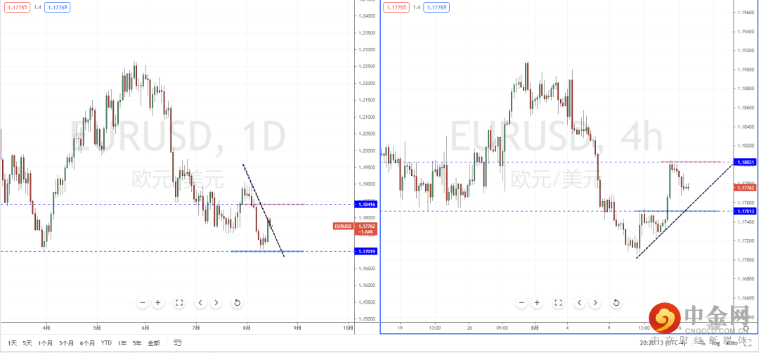 欧美天图:目前行情虽然在相对底部区间筑底上行,但由于美元动能减弱。对于欧美而言在冲击下降趋势线附近再次受阻。从日内4小时级别,价格在1.18031附近承压,短期可关注价格回测上升趋势线附近的表现。如果起稳可继续关注多头机会,否则,将继续弱势下行调整。