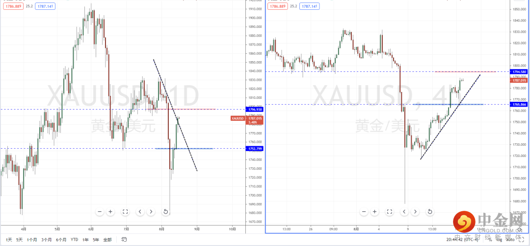 黄金天图:目前行情继续处于上行反弹阶段中,短期价格也已经触及下降趋势线的压制作用附近。从日内4小时级别,价格在临近上方水平压制区域1794.580附近。短期可适当关注价格调整后向上突破的多头机会,如果突破将打开上方多头空间。反之,将可能继续承压。