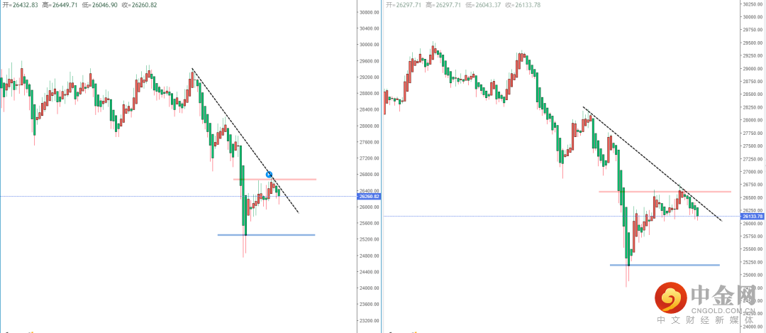 恒生指数天图:短期价格在回测上方压制带26605.51附近再次受阻,同时上方又形成新的多重压制区域。整体格局处于在空头阶段中,从日内4小时级别,可适当关注价格在承压后继续下行的空头机会,下方区间目标位置参考25350.49附近。
