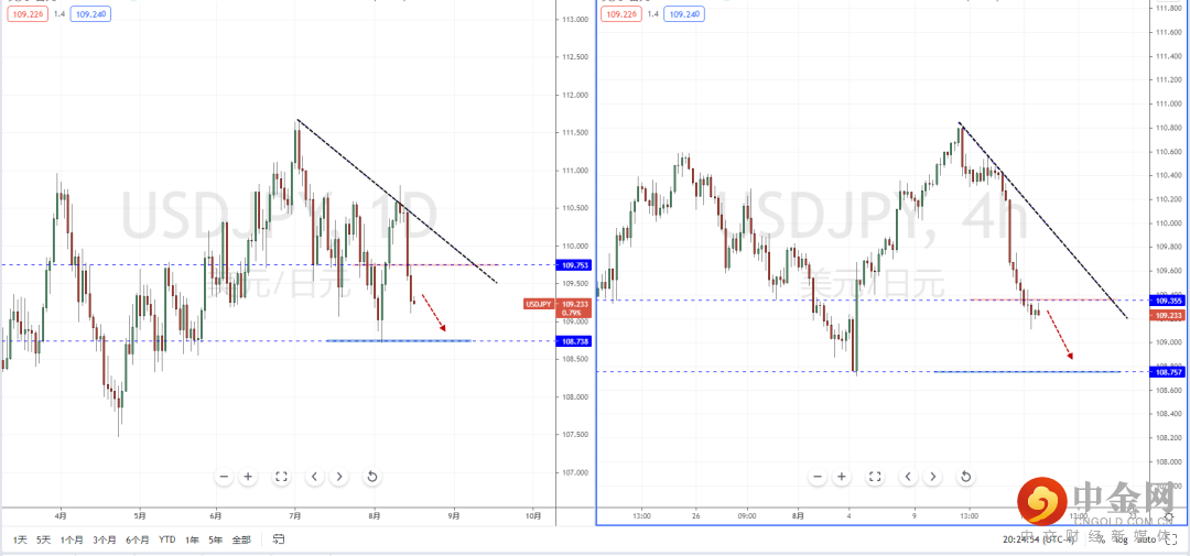 美日天图:目前整体趋势继续处于在空头阶段中,上方有下降趋势线的压制作用,并且价格坚决跌破水平支撑带109.753附近。从日内4小时级别,由于趋势持续向下,尚未出现有效调整,不宜追空行情。可适当关注价格调整后的空头机会,下方目标位置参考108.757附近。