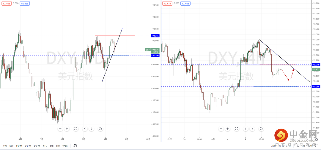 美元指数天图:短期价格在受到后大幅回落,虽然有跌破上升趋势线的支撑作用,但下方有较强的水平支撑带在92.396附近。从日内4小时级别,虽然趋势趋于偏空阶段,动能也处于在逐步放缓之中。短期可适当价格回测上方压制后的表现,如果受阻可继续关注空头,反之,则继续向上反弹。