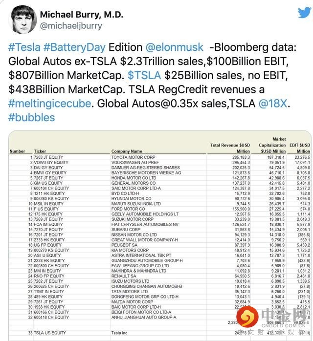 早在2020年末,Burry就开始关注特斯拉股票。他在社交媒体陆续发布消息,称特斯拉此前依赖监管政策获得收益,但这会阻碍特斯拉的长期发展;与业内其他公司相比,特斯拉的估值过高。除此之外,Burry账户多条关于特斯拉的推文都被标记上话题#泡沫。