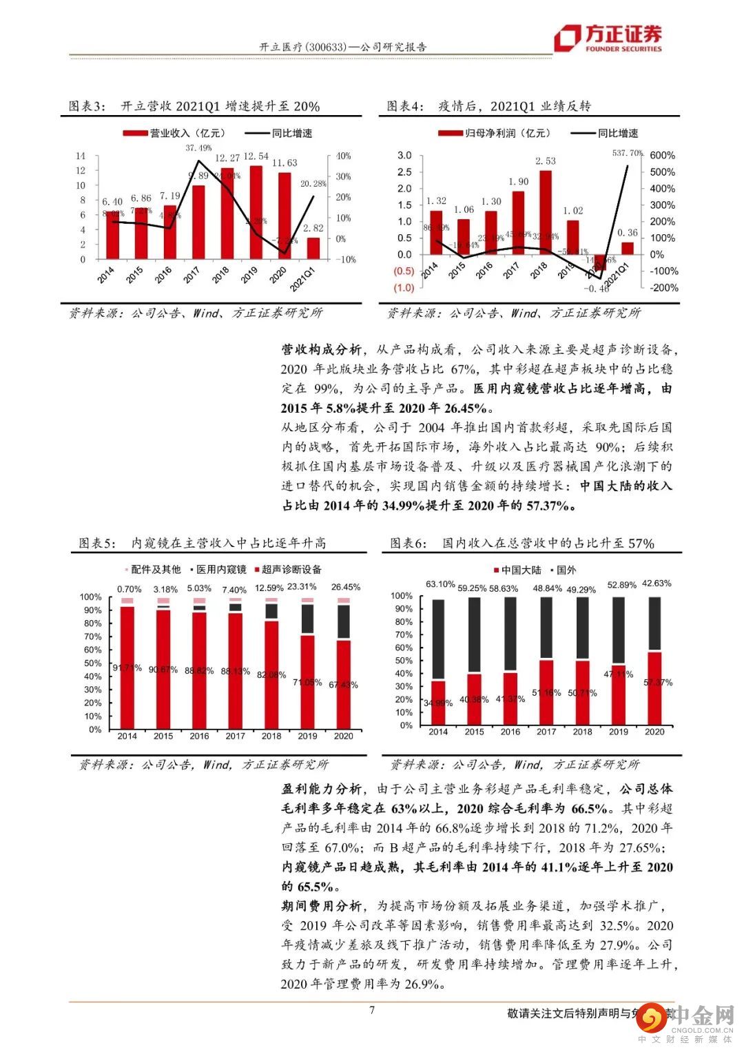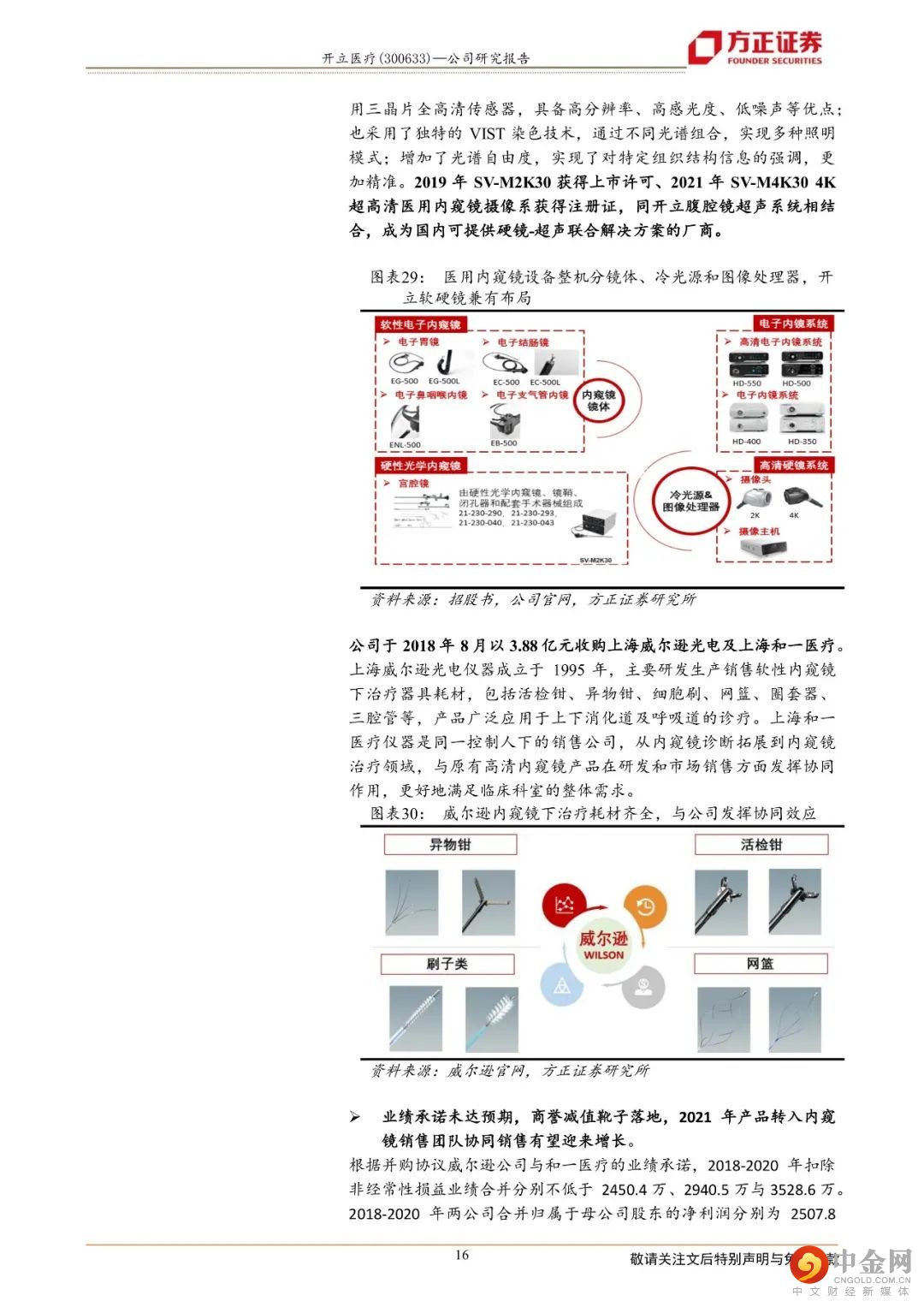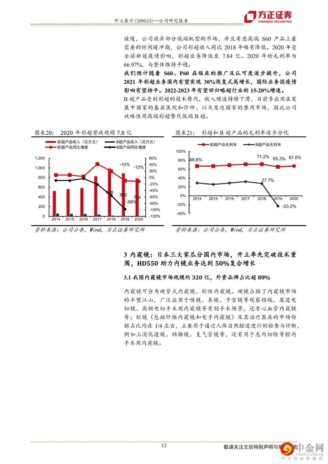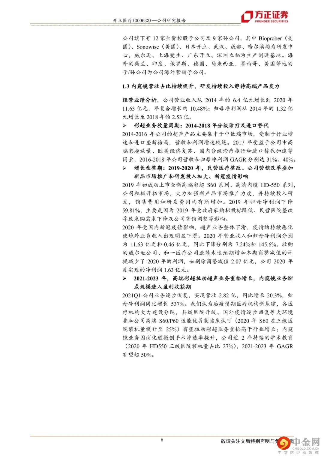 1)公司深耕超声领域20年,构筑核心技术壁垒,高端彩超S60/P60有望拉动超声业务重拾稳健增长。国内高端彩超技术仍被“GPS”(GE、飞利浦、西门子)等国外巨头垄断,国产品牌市占率偏低。公司2018年底推出的高端彩超S60逐步获得临床学术权威的认可,P60的AI系统和三维图像技术,能够满足三级四维筛查需求,是国产厂家中目前最领先的妇产科超声产品。我们预计随着S60、P60的临床推广及认可度逐步提升,公司2021年彩超业务有望实现20%左右增长。2)公司国产全高清内窥镜HD-500/550,打破外资技术封锁市场垄断局面,进入盈利收获期。由于内窥镜壁垒高,外资垄断市场,硬镜、软镜市场国产化率分别不足15%、2%。公司“软镜+硬镜+治疗器具”三位一体布局内窥镜业务,毛利率由2013年的24.8%逐步提升至2020年65.5%,2020年公司内镜业务3.08亿渐成规模进入盈利收获期,我们预计2021-2023年内镜业务有望达到50%的复合增速。3)持续加码研发,助力产品优化升级:4k高清镜、超声内窥镜、血管内超声等系列产品潜力突出。公司2020年研发投入2.37亿,占营收比重21%,显著高于同行企业。2021年年初4k高清硬镜系统获得国内注册证;第二代支气管镜已获 CE 认证,电子支气管内窥镜获得国内注册证;细镜、十二指肠镜目前在注册通道中。2021 年超声电子上消化道内窥镜EG-UC5T获欧盟CE认证、预计近年有望完成国内注册,分享消化道癌症筛查诊断大市场。投资评级与估值:预计公司2021-2023年归母净利润分别为2.65亿、3.4亿和4.55亿元,同比分别增长673%、28.3%和33.7%。2021-2023年EPS分别为0.66、0.85和1.13元,对应21-23年PE估值分别为41、32、24倍,维持公司“强烈推荐”投资评级。风险提示:疫情持续影响;市场竞争加剧;新品研发风险;海外产品销售不及预期;商誉减值风险。