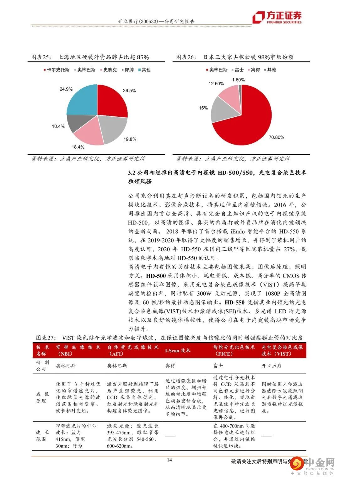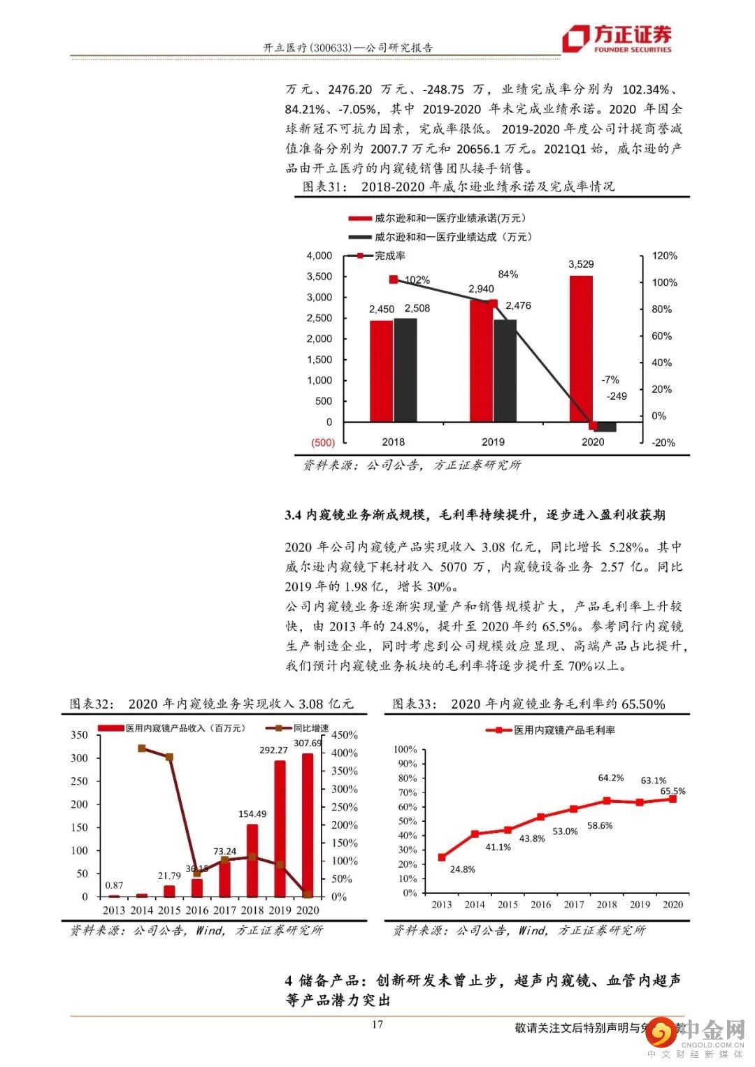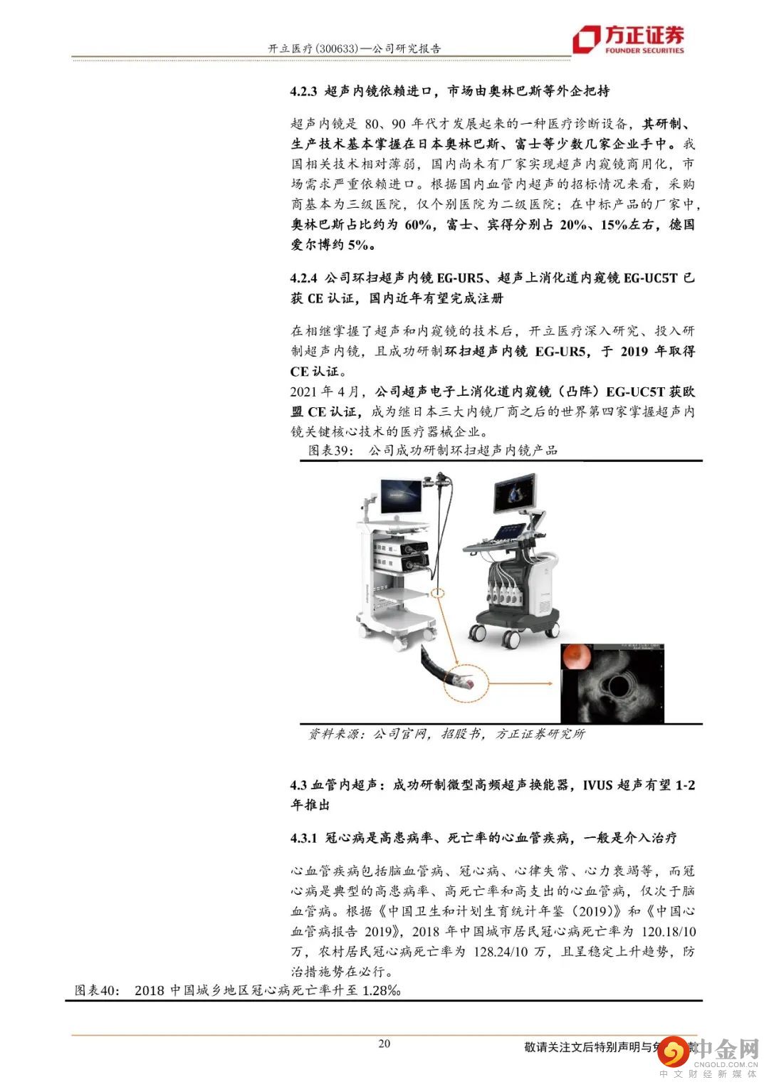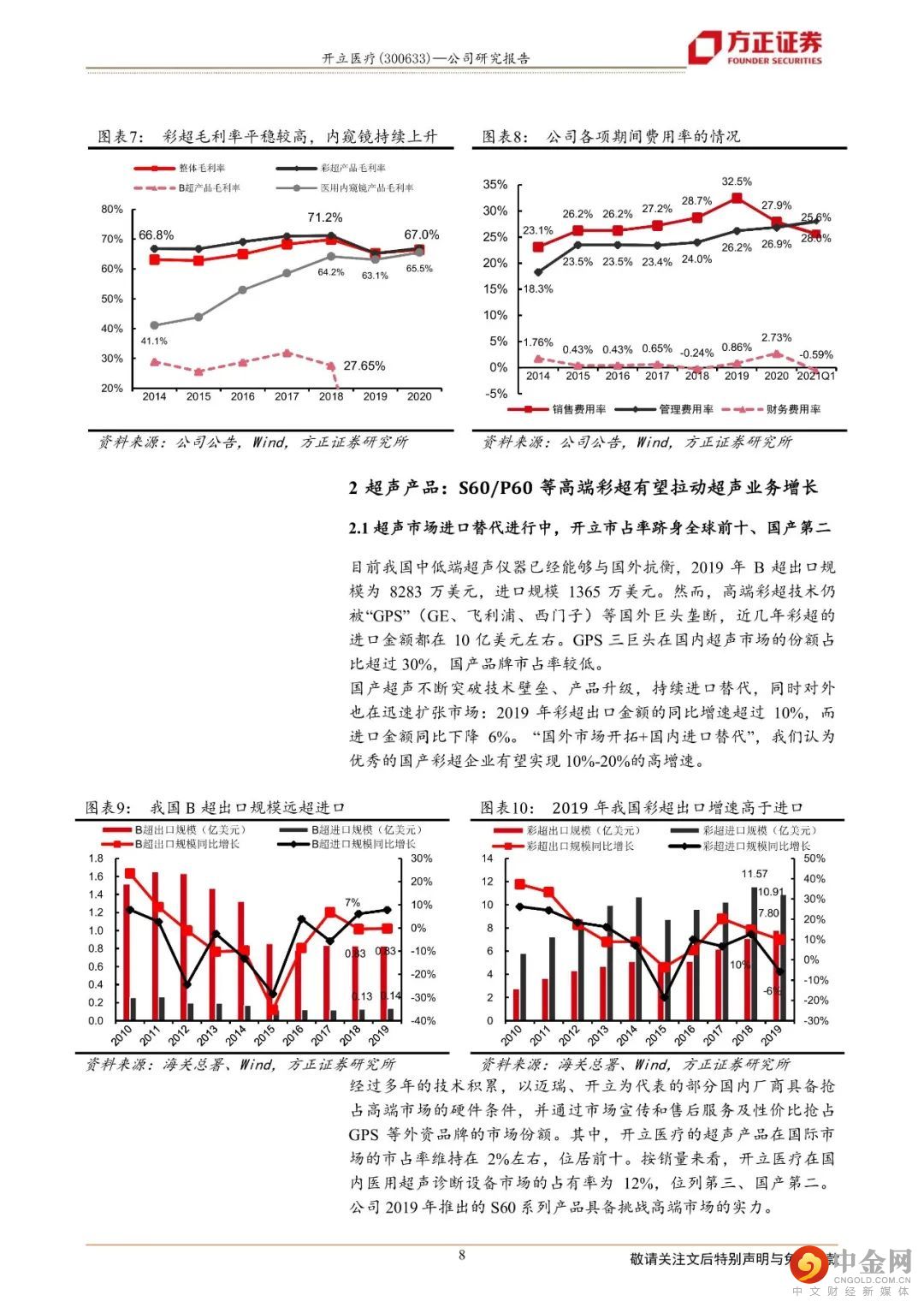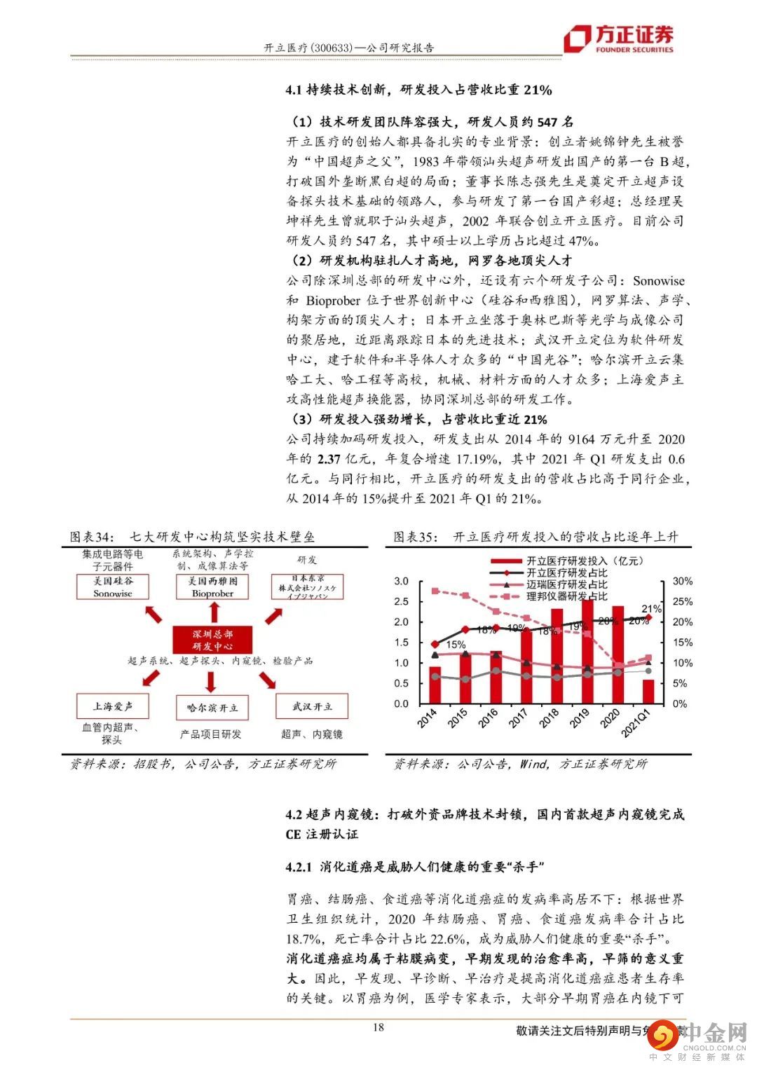 1)公司深耕超声领域20年,构筑核心技术壁垒,高端彩超S60/P60有望拉动超声业务重拾稳健增长。国内高端彩超技术仍被“GPS”(GE、飞利浦、西门子)等国外巨头垄断,国产品牌市占率偏低。公司2018年底推出的高端彩超S60逐步获得临床学术权威的认可,P60的AI系统和三维图像技术,能够满足三级四维筛查需求,是国产厂家中目前最领先的妇产科超声产品。我们预计随着S60、P60的临床推广及认可度逐步提升,公司2021年彩超业务有望实现20%左右增长。2)公司国产全高清内窥镜HD-500/550,打破外资技术封锁市场垄断局面,进入盈利收获期。由于内窥镜壁垒高,外资垄断市场,硬镜、软镜市场国产化率分别不足15%、2%。公司“软镜+硬镜+治疗器具”三位一体布局内窥镜业务,毛利率由2013年的24.8%逐步提升至2020年65.5%,2020年公司内镜业务3.08亿渐成规模进入盈利收获期,我们预计2021-2023年内镜业务有望达到50%的复合增速。3)持续加码研发,助力产品优化升级:4k高清镜、超声内窥镜、血管内超声等系列产品潜力突出。公司2020年研发投入2.37亿,占营收比重21%,显著高于同行企业。2021年年初4k高清硬镜系统获得国内注册证;第二代支气管镜已获 CE 认证,电子支气管内窥镜获得国内注册证;细镜、十二指肠镜目前在注册通道中。2021 年超声电子上消化道内窥镜EG-UC5T获欧盟CE认证、预计近年有望完成国内注册,分享消化道癌症筛查诊断大市场。投资评级与估值:预计公司2021-2023年归母净利润分别为2.65亿、3.4亿和4.55亿元,同比分别增长673%、28.3%和33.7%。2021-2023年EPS分别为0.66、0.85和1.13元,对应21-23年PE估值分别为41、32、24倍,维持公司“强烈推荐”投资评级。风险提示:疫情持续影响;市场竞争加剧;新品研发风险;海外产品销售不及预期;商誉减值风险。