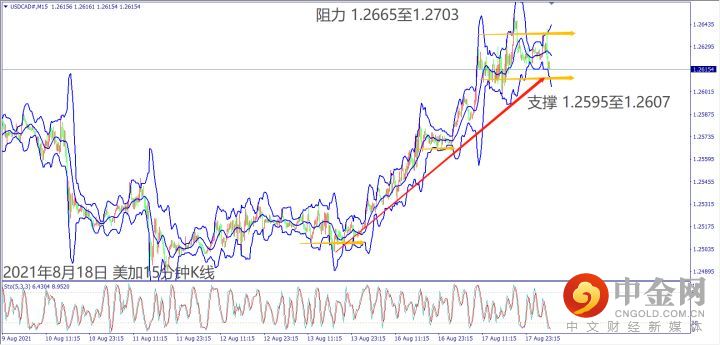 日级别线图,连续上涨出现圆形底反转,守住1.2600关口,有望延续涨势;15分钟K线,短线形成盘涨,一旦突破盘整顶部,有机会挑战前高阻力。