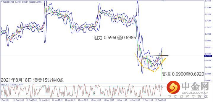 日级别线图,长阴烛回测盘整底部,跌破颈线形成M头,可能延续跌势;15分钟K线,短线出现圆形底,一旦突破0.6930,有机会反弹挑战上方阻力。