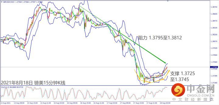 日级别线图,长阴烛掼破三周低点,5日均线反压,可能延续跌势;15分钟K线,短线出现圆形底反转,守住1.3740,有机会反弹挑战起跌阻力。
