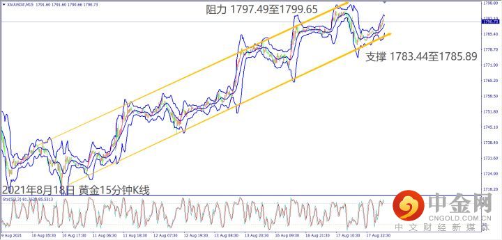 日级别线图,出现十字星反转,1790关口冲不过,可能回测5日均线;15分钟K线,近期出现上升矩形,守住趋势线,有机会挑战上方阻力。