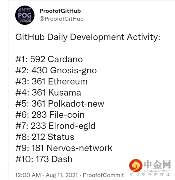许多项目已经建立在测试网上的智能合约功能上。 自 Alonzo 测试网开始以来,开发人员的活动显着增加,自 8 月 6 日 Alonzo Purple 开始参与项目以来,Cardano 的提交数量在 Github 上位居榜首。 这里值得注意的问题是提交的数量一直呈稳步上升趋势,8 月 11 日有近 600 次提交,而两天前只有 545 次。 这表明越来越多的开发人员正在 Alonzo 上工作或尝试构建一些东西,这是一个非常令人鼓舞的开始。