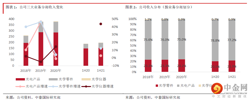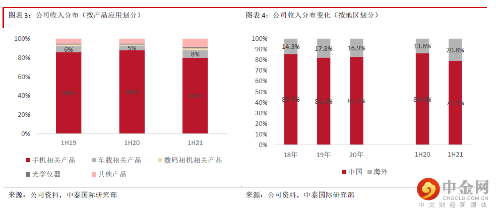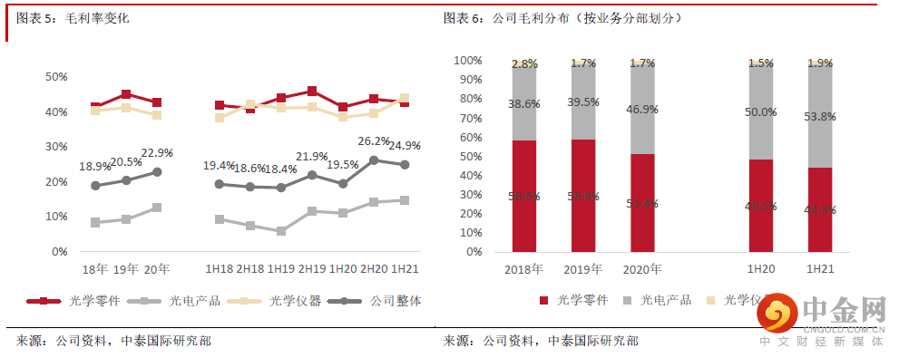 1H21收入同比增长5.1%至198.3亿元人民币,符合我们预期,主要受三大主要产品出货量增长推动;毛利同比增长34.5%至49.5亿元人民币,毛利率同比提高5.4个百分点至24.9%,优于我们预期,主要受惠光电产品及光学仪器毛利率提升;由于加大了车载领域及AR/VR领域的研发投入,研发费用占收入的比例同比提高1个百分点至6.7%;净利润同比增长52.4%至27.1亿元人民币,略优于我们预期。