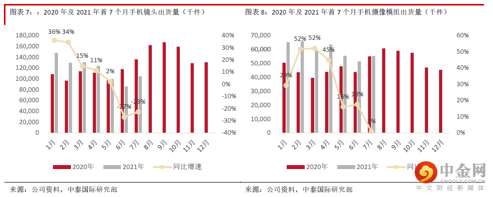 基于上半年出货量情况,管理层将手机镜头全年出货量增速指引由年初的15-20%下调至5-10%。今年首七个月手机镜头出货量为8.2亿件,同比增长5.2%。公司在A客户的拓展进程顺利,有助未来市占率进一步提升。1H21 6P及以上手机镜头出货量同比增长2.9%,逊于整体表现,反映手机镜头升级恢复进程未如预期,对ASP及毛利率造成一定压力。