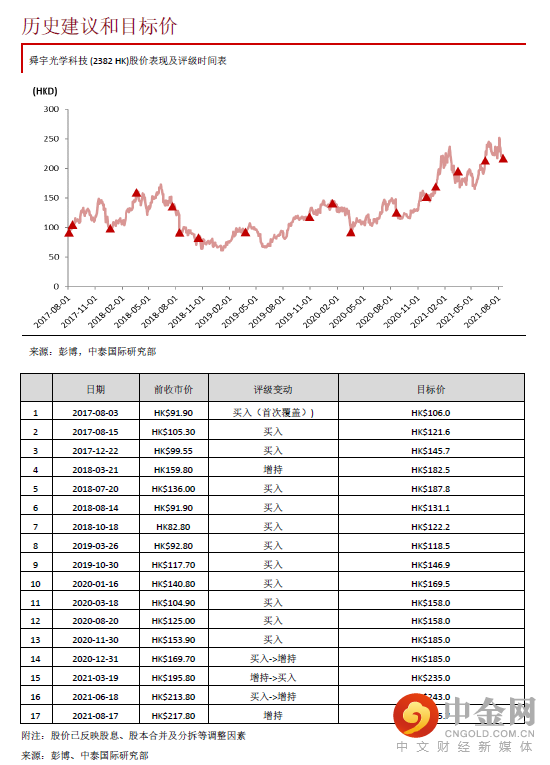 我们调整盈利预测,以反映今年出货量指引变化、毛利率提升及研发投入增加,预期明年公司将可受惠手机市场逐步复苏、手机光学升级更为明显及头部集中度提升,车载领域放量及升级进程亦将加速,21/22年EPS将分别为4.91/5.69元人民币。滚动至以36倍22E PE估值,相应上调目标价至245.7港元,潜在升幅12.8%,维持“增持”评级。