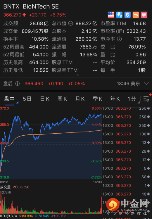 Moderna大涨7%,市值上涨113亿美元,约合733亿人民币。最新市值1622亿美元,约合1.05万亿人民币。