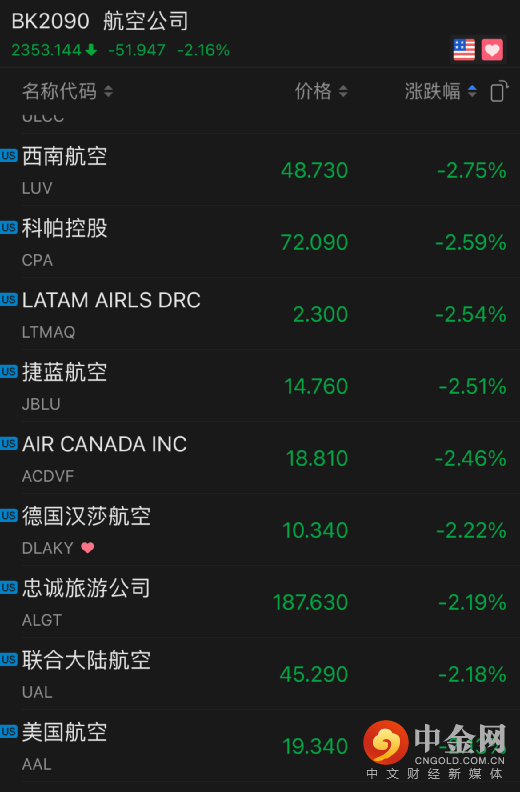航空板块全线走低,波音跌3%,美国航空跌超2%,西南航空跌近3%,联合航空跌超2%。