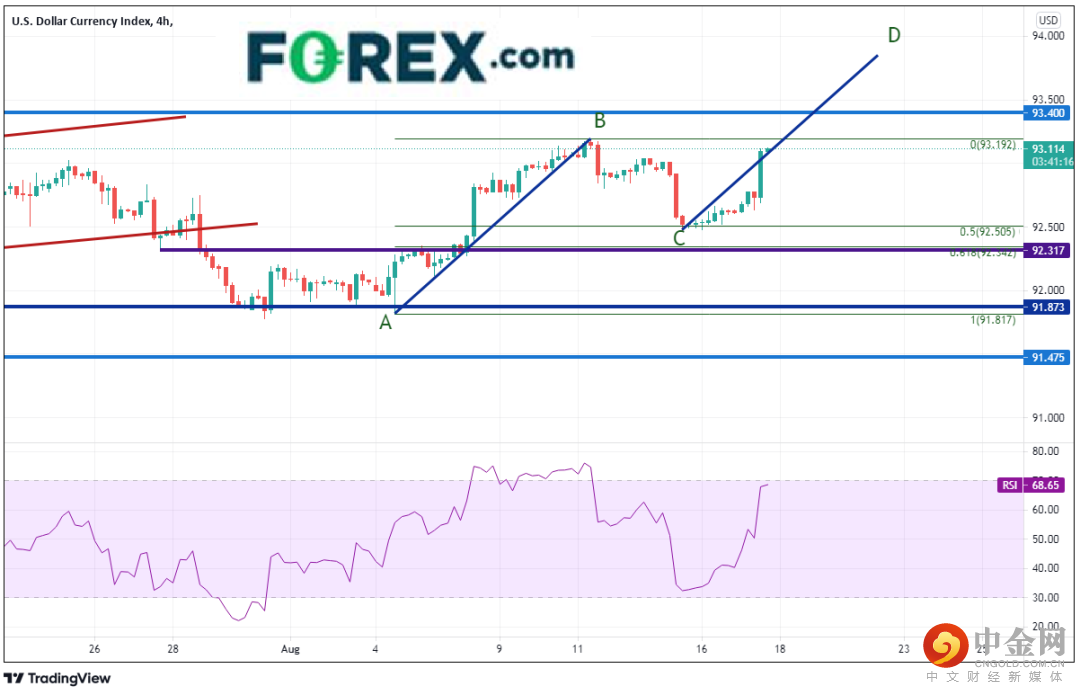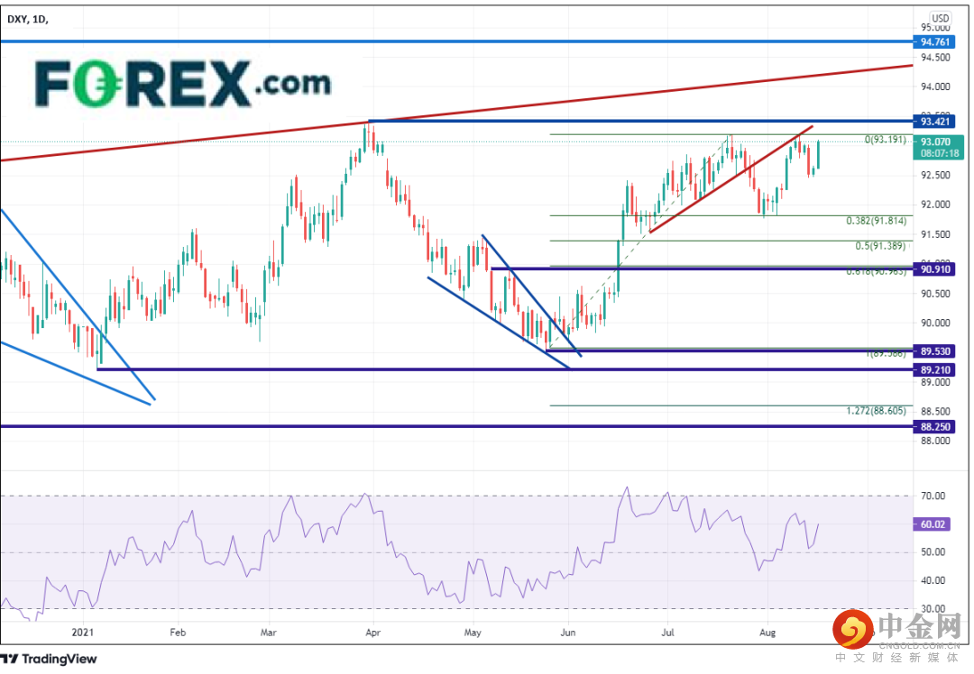 目睹上述数据的交易者逃往美元避险,推高该货币(同时,债券与股市随着债券收益率上涨而下跌,同样利多美元。)美元指数7月21日未能站上3月31日高点93.42,随后回撤至5月25日低点到7月21日高点的38.2%回档位91.81附近,接着反弹并测试7月21日高点与上升趋势线93.19附近。美元指数周二上涨并再度尝试攻克前述各个价位。