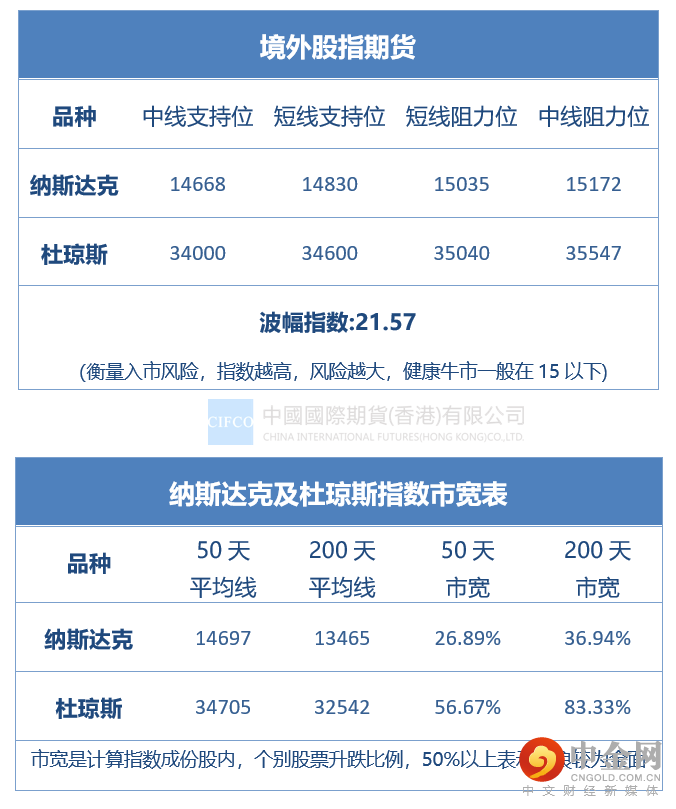 三大指数昨日终于有所突破近周窄幅上落,但方向却是回吐支持区,如果纳指14800支持失守,纳指有大机会出现较长时间回吐压力。而就市宽看,纳指成份股不足40%公司处于200天线之上,即是目前高企指数主要由十大科企股支持,为做空提供借口。杜指情况亦处困局,突破35000,最高见35539,升幅只有1.5%,目前又在35000点附近徘徊,动力明显不足。