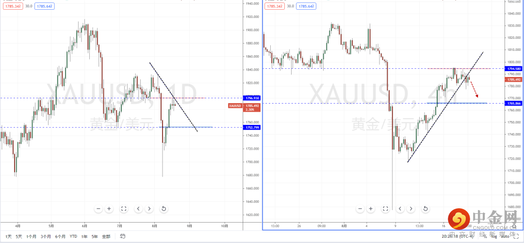 黄金天图:短期价格在冲击上方水平压制带1796.930附近受阻,同时又有下降趋势线的压制作用。从日内4小时级别,价格在1794.580压制区域徘徊后跌破上升趋势线,可适当关注价格调整后下行的空头机会,下方目标位置参考1765.866附近。