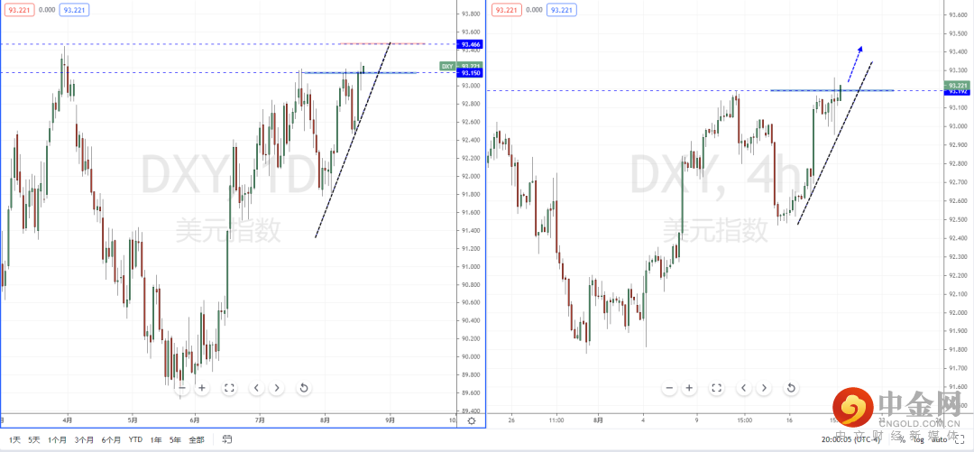 美元指数天图:目前行情继续保持多头方向,短期价格在关键压制区域93.150附近继续上行,下方有上升趋势线的支撑作用。从日内4小时级别,价格在纠结之后上行突破。可适当关注价格突破后的多头机会,上方目标位置参考93.466附近。