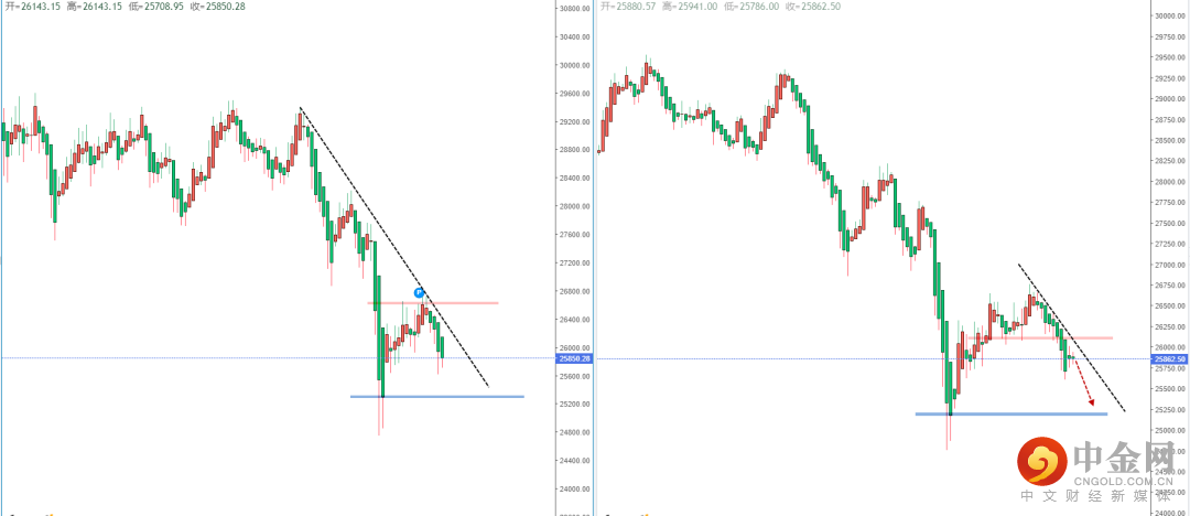 恒生指数天图:目前行情保持空头方向,价格在上方多重压制区域受阻后继续下行,上方水平压制带在26609.54附近。从日内4小时级别,可关注趋势调整后继续走弱机会,但需要注意空头幅度,目标位置参考前期低点附近。