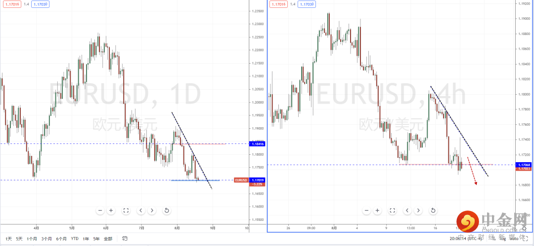 欧美天图:目前行情继续在下降趋势线的压制作用下承压,由于美元短期继续上冲,迫使欧美在关键支撑位置1.17019附近徘徊。从日内4小时级别,价格在关键区域有下破迹象。可适当关注价格调整后破位的空头机会,目标位置参考周线前期低点附近。