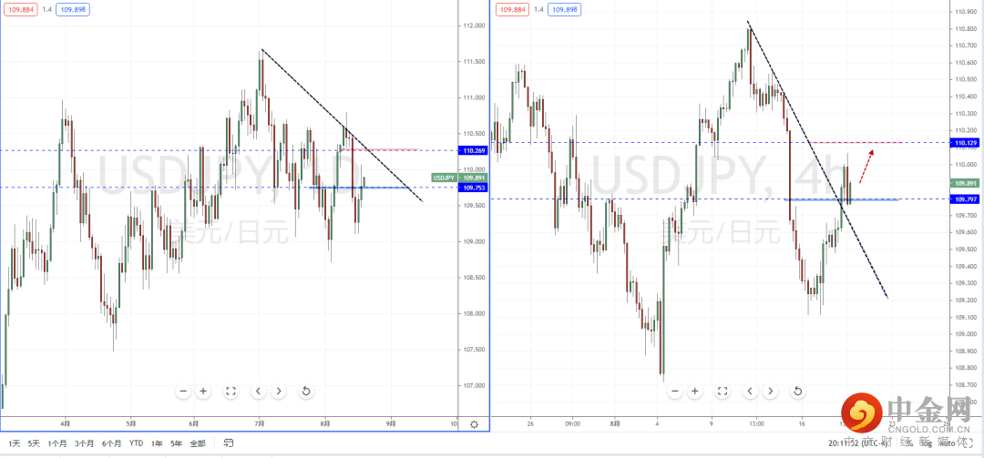 美日天图:目前整体趋势虽然处于在空头阶段中,上方有下降趋势线的压制作用。但价格在破位之后继续向上反弹,并且站上水平压制带109.753附近。从日内4小时级别,短期下降趋势线也被有效突破,可适当关注价格调整后继续反弹多机会,上方目标位置参考110.129一带。