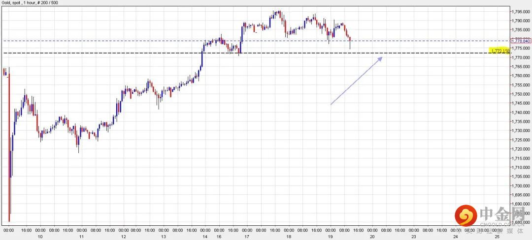 可以部署在$1,800美元左右建立淡仓盘,短线看淡金价一线至$1,772美元水平,止损在$1,808美元。