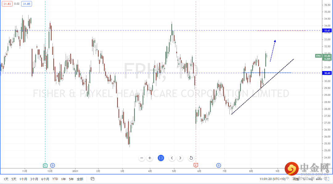 FPH:由于近期市场因受到数据影响,使得大部分ETF产业大幅向下运行,也出现趋势弱势疲软的状态。但从FPH目前整体趋势在短期回测关键支撑带30.60附近后强势起稳,并且下方有上升趋势线的支撑作用。短期可适当关注价格调整调整后继续上行的多头机会,上方区间目标位置参考33.67一带。