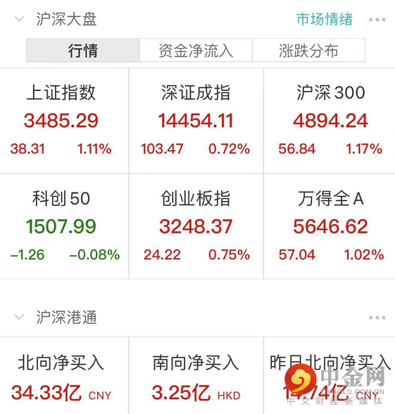 截至收盘,沪指涨1.11%报3485.29点,深成指涨0.72%报14454.11点,创业板指涨0.75%报3248.37点;两市合计成交11972亿元,北向资金净流入34.33亿元。