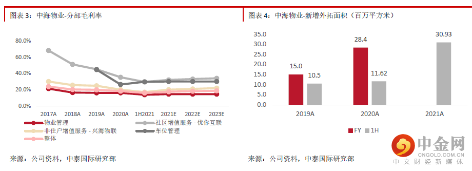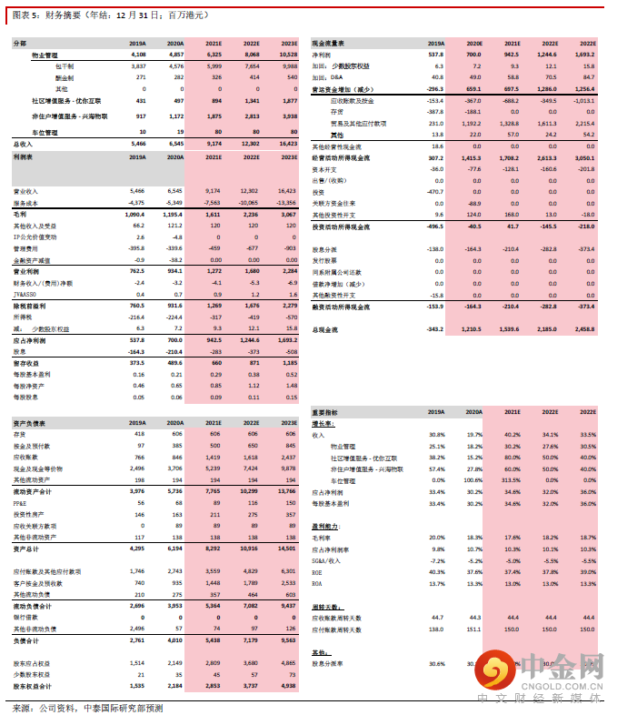 21年上半年收入同比增50.7%至42.96亿港元,其中1)物业管理服务收入同比增36.5%至30.44亿;2)住户增值服务收入+102%YoY至3.85亿,占收入比重升至9.0%(vs FY20:7.6%);3)非住户增值服务收入+89.4%YoY至7.97亿,其中工程服务收入+124.3%至3.09亿;4)停车位买卖收入+680%YoY至0. 69亿。公司增值服务收入增速大幅超出公司历史均值以及高于我们的预测。公司整体毛利率16.1%,低于去年全年的18.3%,其中1)物业管理服务毛利率13.8%(vs FY20: 16.1%), 主要由于包干制项目占比提升以及外拓项目利润率相对较低;2)住户增值服务/非住户增值服务毛利率分别为29.5%/17.1%,低于FY20的35.2%/20.1%,主要由于部分服务单价下降、人手增加及服务范围扩大。随着公司进入快速发展期,毛利率面临结构性压力,我们预计随外拓面积占比上升趋缓,毛利率水平将趋于稳定。SG&A占收入比重由FY20的5.2%下降至1H21的4.7%;应占净利润率由FY20的10.7%下降至1H21的9.2%。财务负债表稳健,期末现金32.6亿;应收账款天数升至59(vs FY20:45),处于较优水平。