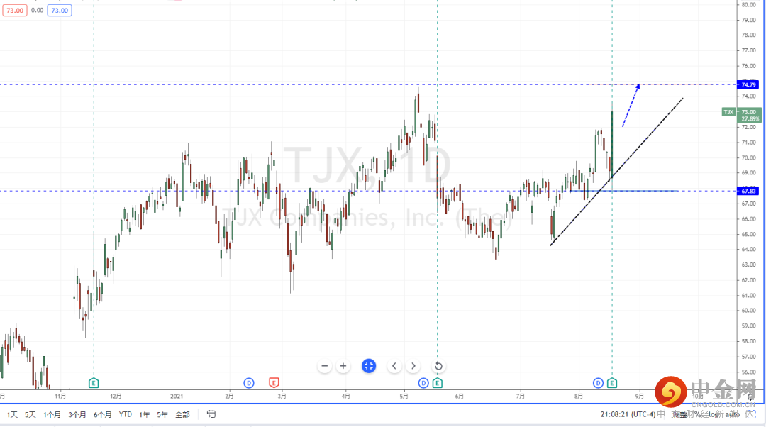 TJX:由于遭受经济数据不利因素影响,目前整体市场趋于偏空阶段,从ETF各产业表现也处于弱势下行中。但从TJX目前趋势表现在短期回测支撑带67.83附近后强势起稳后,并且价格也突破前期压制带71.90附近。短期可适当关注价格调整后继续向上多头机会,上方区间目标位置参考74.79一带。