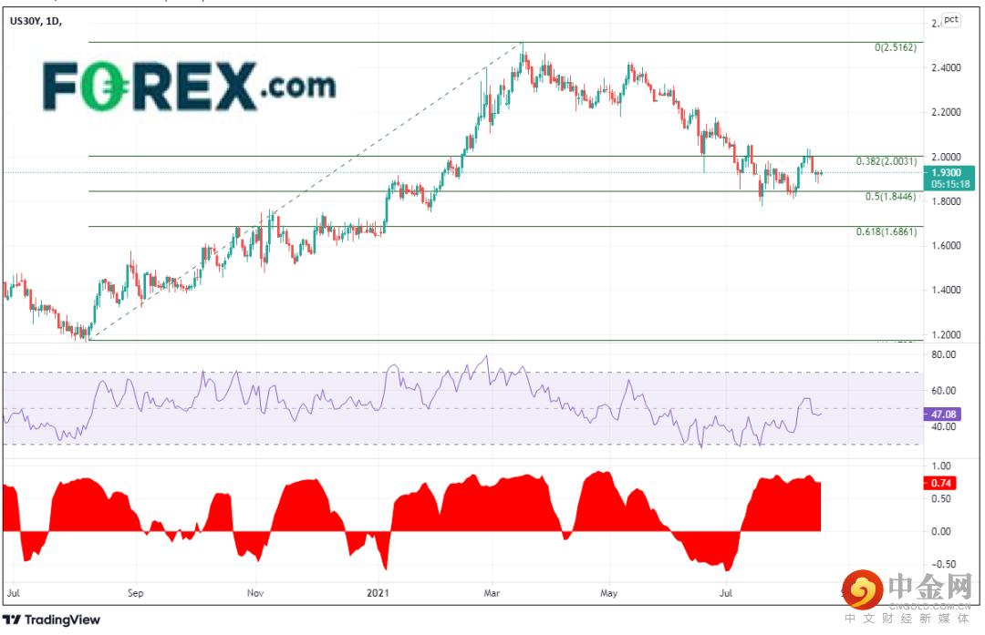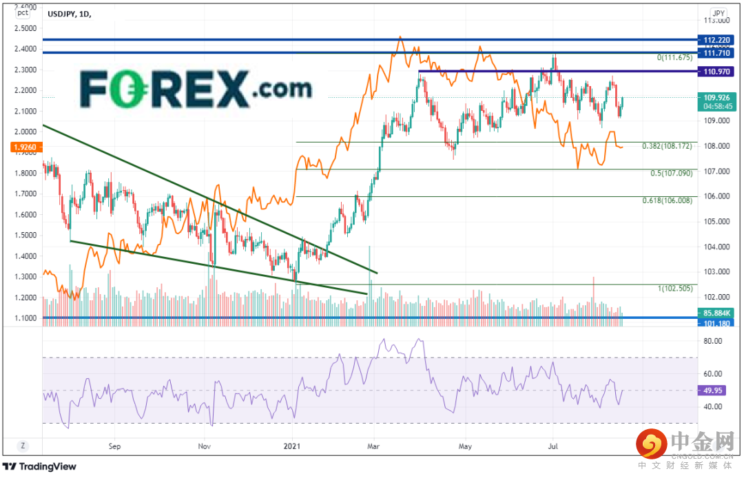 30年期债券收益率已自3月18日高点2.2156回落至7月20日的低点1.7800,但长期债券收益率设法守住了2020年8月7日低点到3021年3月18日高点行情的50%回档位构成的支撑,即1.8446附近。自从在7月20日最低到达1.7800以来,30年期债券收益率一直围绕着1.8110-1.9720区间起伏,等待美联储给出新的信号。请注意日图上30年期债券收益率和美元/日元之间的关联系数:目前报在+0.74。该数字6月初从负值回升,随后持续走高,最高到达+0.85,到了7月底趋于平缓。正如我们在以前文章所讨论的,债券收益率近期的走势可以帮助美元/日元交易者判断方向。收益率上涨,美元/日元随之走高,反之亦然。