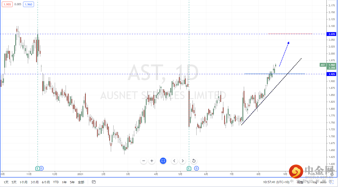 AST:由于目前整体市场环境处于在弱势空头阶段中,大部分产业频频拐头向下运行。但公用事业ETF产业则依然保持多头方向,从AST目前整体趋势表现一直处于上升趋势线阶段中,下方有上升趋势线的支撑作用。并且短期价格也再次突破前期压制带1.925附近。可适当关注价格调整后继续上行机会,上方区间目标位置参考2.070一带。