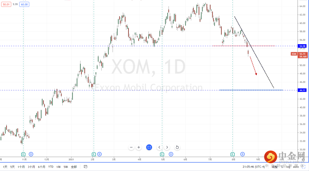 XOM:目前由于整体市场环境处于空头阶段中,从ETF产业中能源类产业近期持续领跌,使得相关的能源类个股出现幅度下行状态。从XOM目前整体趋势表现,价格在短期横盘调整后再次跌破关键支撑带54.58附近。并且上方有下降趋势线的压制作用,可适当关注价格调整后继续走弱的空头机会,下方目标位置参考44.11附近。