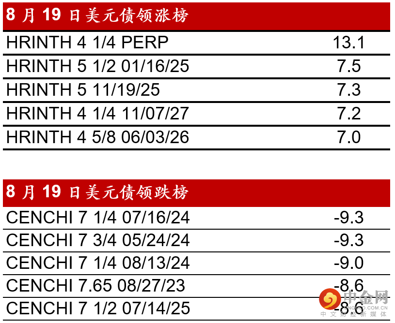 昨日(8月19日),受部分负面中期业绩报告影响,中国高收益债券市场整体情绪走弱。建业地产因中期业绩低于市场预期,现金水平大幅下降,回笼现金流恶化,暴跌8-10pts。其他地产债券也受到市场情绪恶化波及出现不同程度下跌,佳兆业下跌0.5-1.25pts,中国奥园下跌1.5-2pts,融创下跌0.5-1.5pts,其他单B评级下跌约0.5-1.5pts,BB评级债券也有约0.25-0.75pts的跌幅。