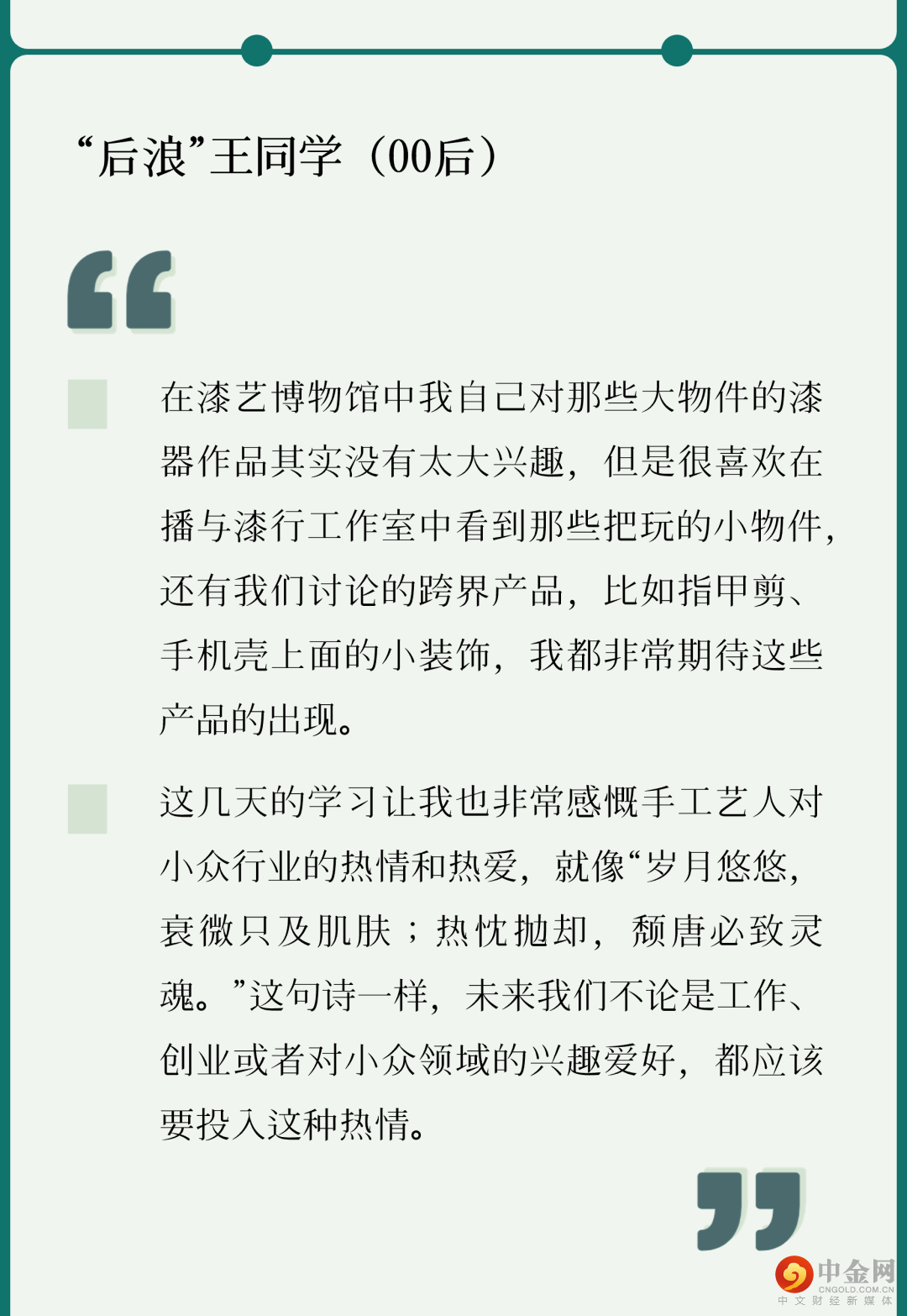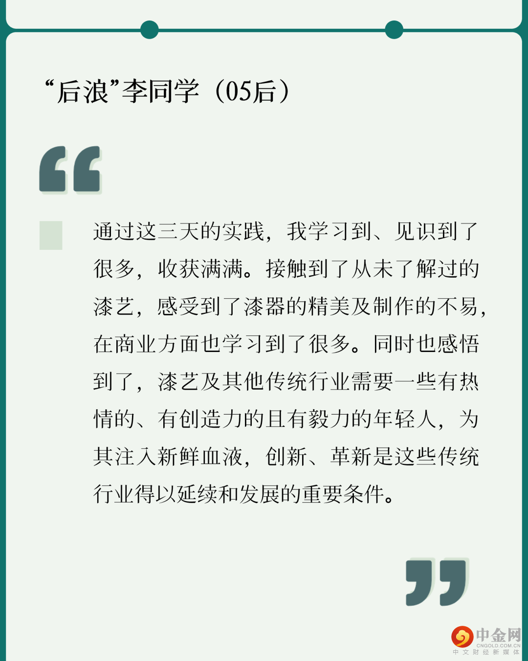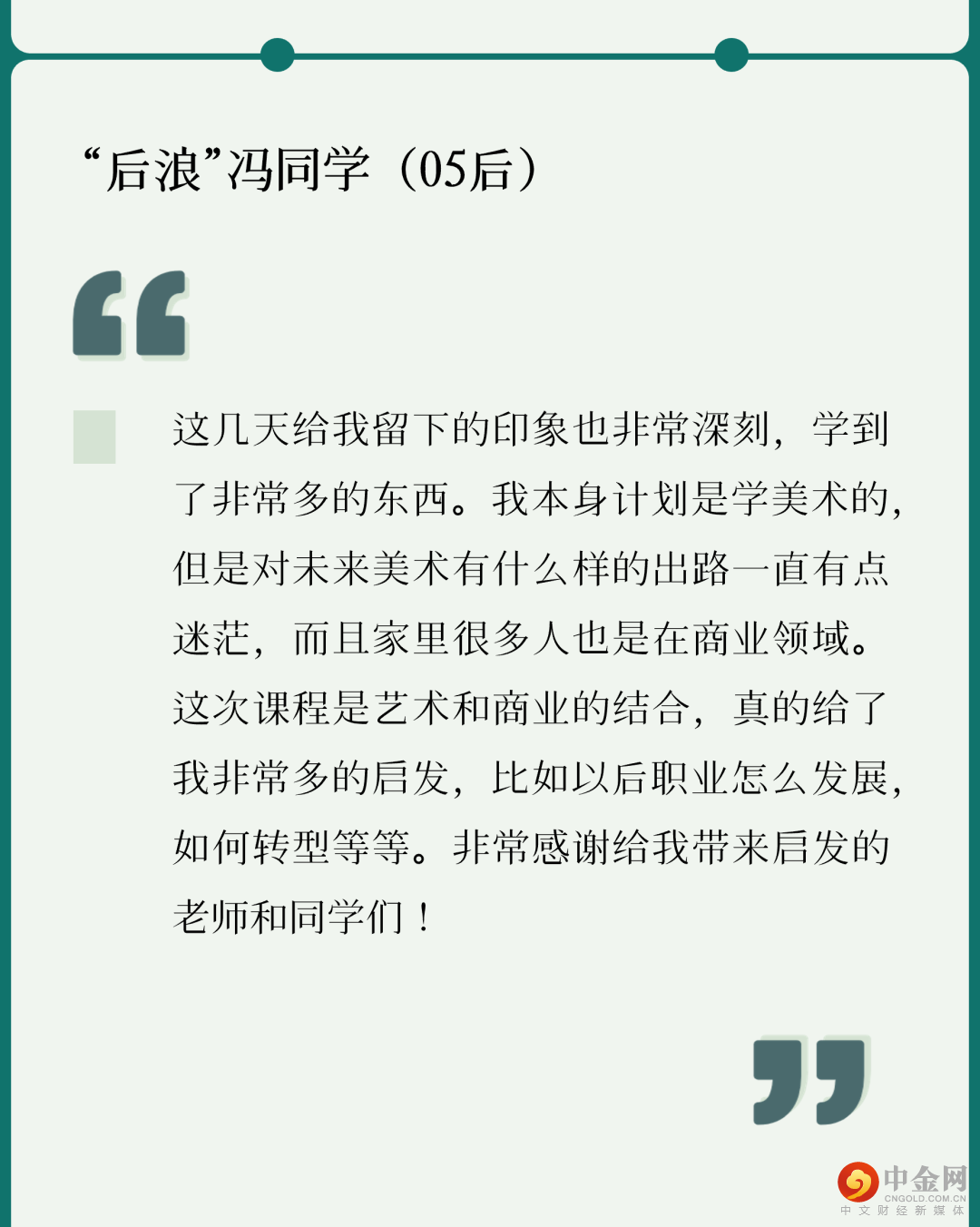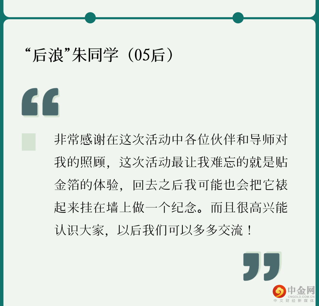 “我很喜欢在实践中看到的一句话‘Inspire the Young’,年轻人是‘后浪’,是未来的新星,是不可限量,‘后浪’也定然会赶超‘前浪’的步伐,在未来,发光发亮!”