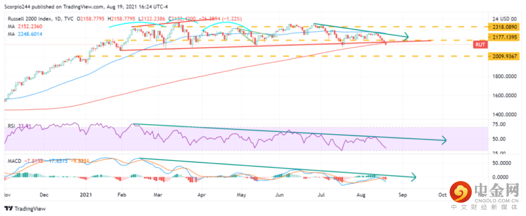 罗素2000指数明日很容易出现上周,如果未能上涨,则相对强弱指数RSI可能会创新低,如果你希望罗素2000指数触底的话,这是你最不想看到的情况。