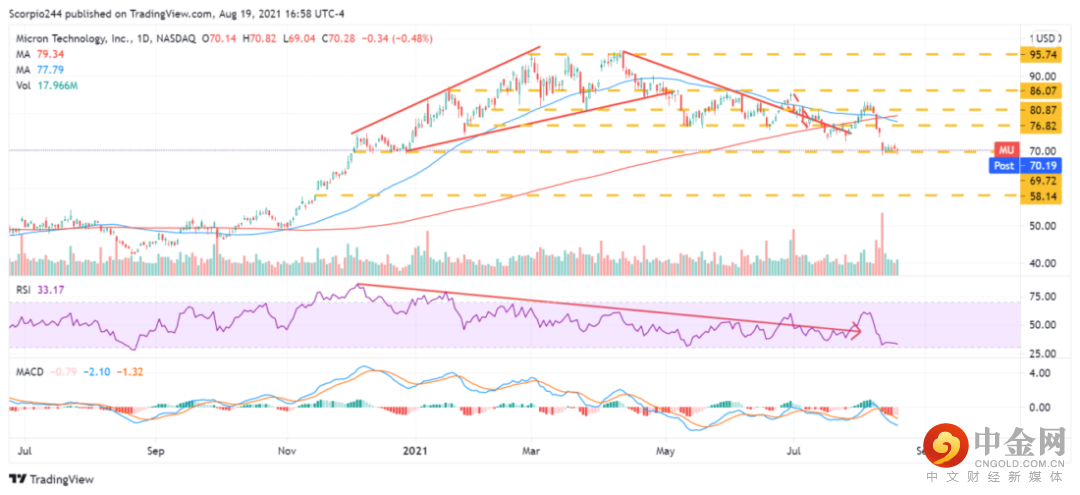 随着美光科技股票跌破70美元的支撑线,汹涌的抛售即将出现。美光科技股价未来可能大跌,可能回落至58美元。