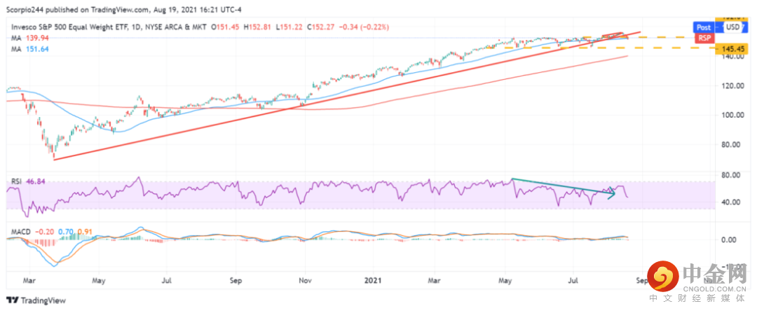 事实证明观望是正确的,标普500等权指数基金在本周下跌近2%,跌破152.50美元处的支撑线和2020年上升趋势线。另外,标普500等权指数基金的MACD目前也转头向下。