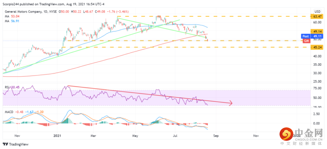 通用汽车面临的困境与福特汽车类似,如果通用汽车的股价跌破49美元的支撑线,则该公司股票下一个可能止住跌势的位置在45.25美元附近。