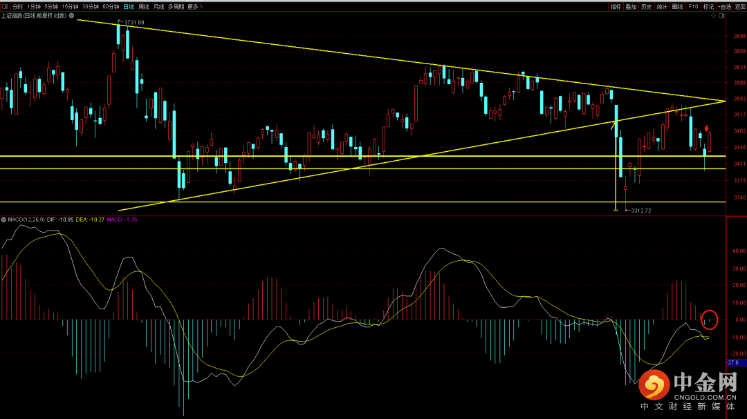 大盘出现跳空高开,短期回补了上周五的缺口,周二需要继续关注上方3487附近的缺口,而这个位置如果继续向上需要注意动能的衰竭,大概率会出现折返回补周一的跳空缺口。